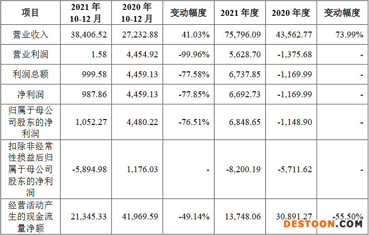 2021年,拓荆科技实现营业收入75,796.09万元,同比增长73.99%;实现归属于母公司股东的净利润6,848.65万元;实现扣除非经常性损益后归属于母公司股东的净利润-8,200.19万元;经营活动产生的现金流量净额为13,748.06万元,同比下降55.50%。