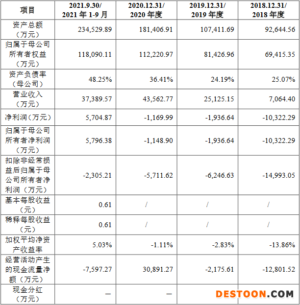 2018年、2019年、2020年和2021年1-9月,拓荆科技实现营业收入分别为7,064.40万元、25,125.15万元、43,562.77万元和37,389.57万元,实现归属于母公司所有者净利润分别为-10,322.29万元、-1,936.64万元、-1,148.90万元和5,796.38万元,实现扣除非经常损益后归属于母公司所有者净利润分别为-14,993.05万元、-6,246.63万元、-5,711.62万元和-2,305.21万元,经营活动产生的现金流量净额分别为-12,801.52万元、-2,175.61万元、30,891.27万元和-7,597.27万元。