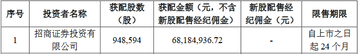 保荐机构相关子公司招商证券投资有限公司本次跟投获配948,594股,占本次公开发行数量的3%,获配金额6,818.49万元,股票限售期为24个月。