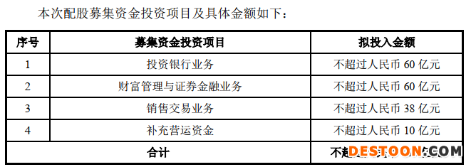 公开资料显示,东方证券本次配股募集资金168亿元的规模仅次于中信证券刚完成的273亿的配股募资,募集资金主要投入投资银行、财富管理与证券金融等业务。