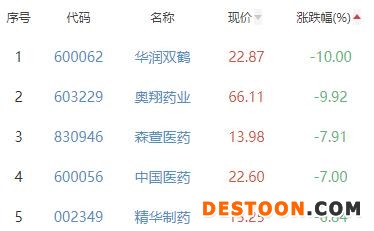 华润双鹤、奥翔药业、森萱医药、中国医药、精华制药位列涨幅榜后五位,涨幅分别为-10.00%、-9.92%、-7.91%、-7.00%、-6.84%。