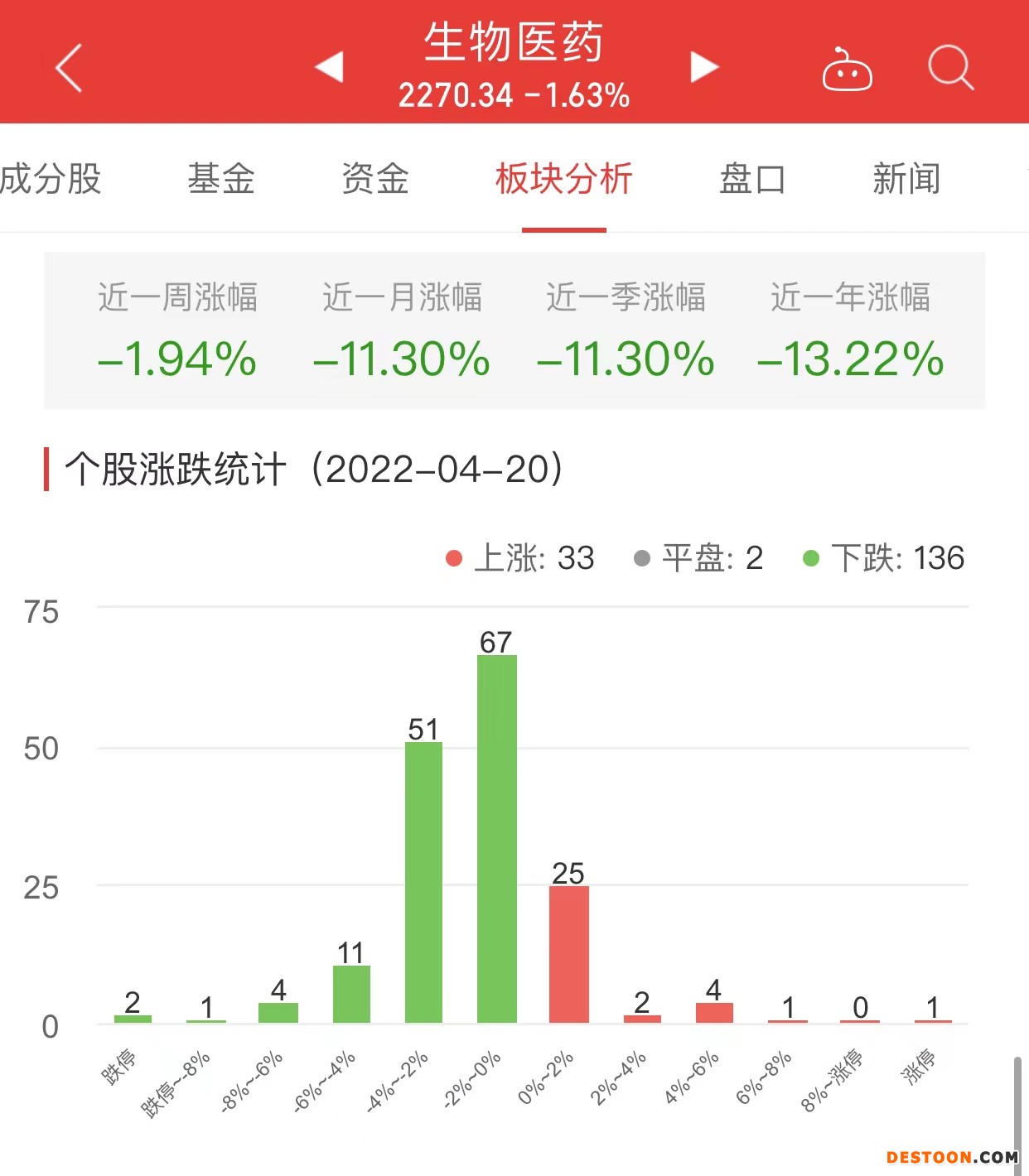 中国经济网北京4月20日讯 今日,生物医药板块整体跌幅1.63%,其中33只股票上涨,2只股票平盘,136只股票下跌。