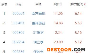 其中,南京高科、富祥药业、ST银河、信立泰、保龄宝位列板块涨幅前五位,涨幅分别为6.14%、5.53%、5.16%、5.12%、4.30%。