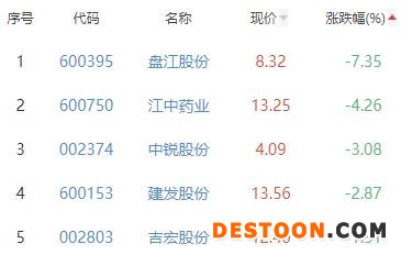 盘江股份、江中药业、中锐股份、建发股份、吉宏股份位列涨幅榜后五位,涨幅分别为-7.35%、-4.26%、-3.08%、-2.87%、-1.51%。