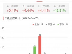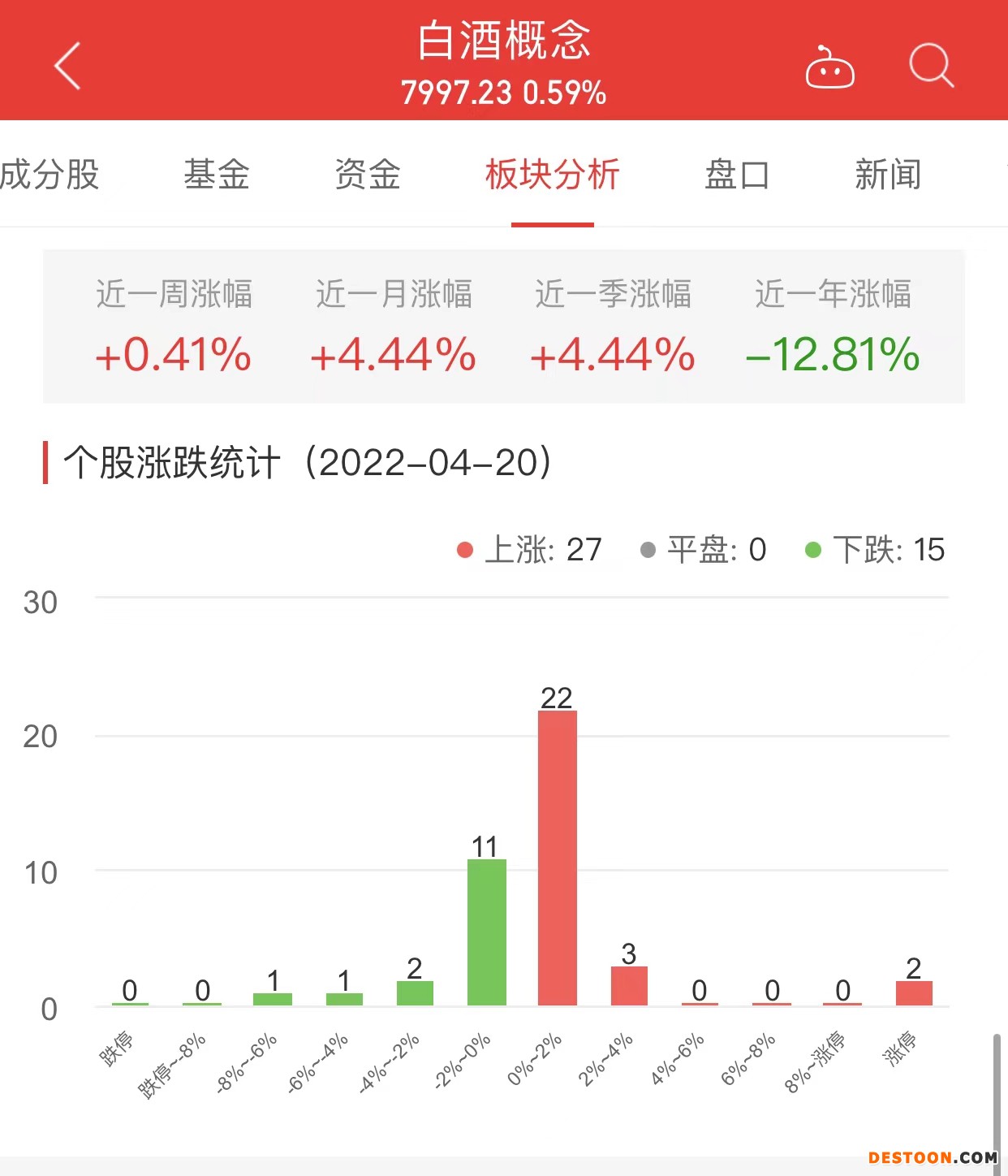 中国经济网北京4月20日讯 今日,白酒概念板块整体涨幅0.59%,其中27只股票上涨,0只股票平盘,15只股票下跌。