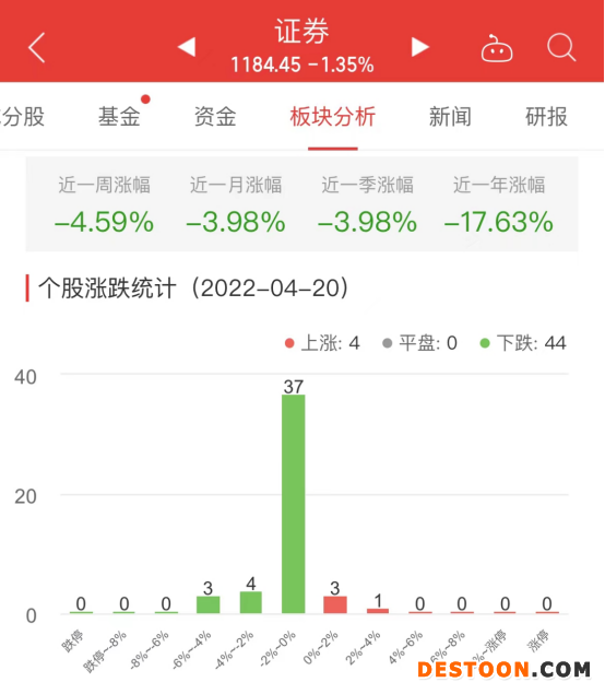 中国经济网北京4月20日讯 今日,证券板块整体跌幅1.35%,其中4只股票上涨,0只股票平盘,44只股票下跌。