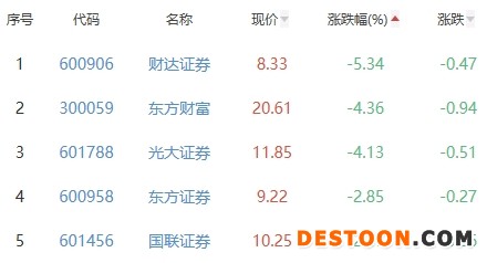 财达证券、东方财富、光大证券、东方证券和国联证券位列板块涨幅榜后五位,涨幅分别为-5.34%、-4.36%、-4.13%、-2.85%和-2.47%。