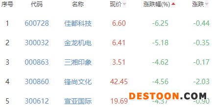 佳都科技、金龙机电、三湘印象、锋尚文化和宣亚国际位列板块涨幅榜后五位,涨幅分别为-6.25%、-5.18%、-4.62%、-4.56%和-4.37%。
