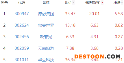 其中,德必集团、完美世界、欧菲光、云南旅游和华立科技位列板块涨幅榜前五位,涨幅分别为20.01%、6.63%、4.31%、3.68%和3.44%。