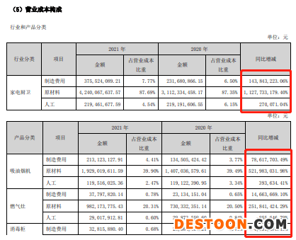 在营业成本构成部分,财报将同比增长比例错写成增长值,显示家电厨卫行业的制造费用同比增长143843223.06%,原材料成本同比增长1127733179.40%,人工成本同比增长270071.04%。