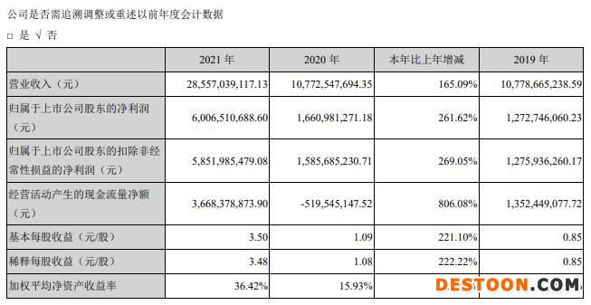 2、年报显示,报告期内你公司实现营业收入 285.57 亿元,同比增长165.09%;实现归母净利润 60.07 亿元,同比增长 261.62%;实现经营活动产生的现金流量净额 36.68 亿元,同比增加 806.08%。