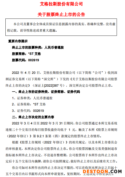 *ST艾格4月20日晚间发布公告,公司收到深交所下发的《关于艾格拉斯股份有限公司股票终止上市的决定》(深证上[2022]387号),深交所决定公司股票终止上市,不设退市整理期。