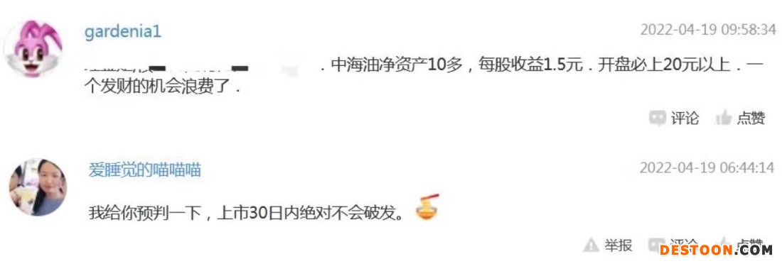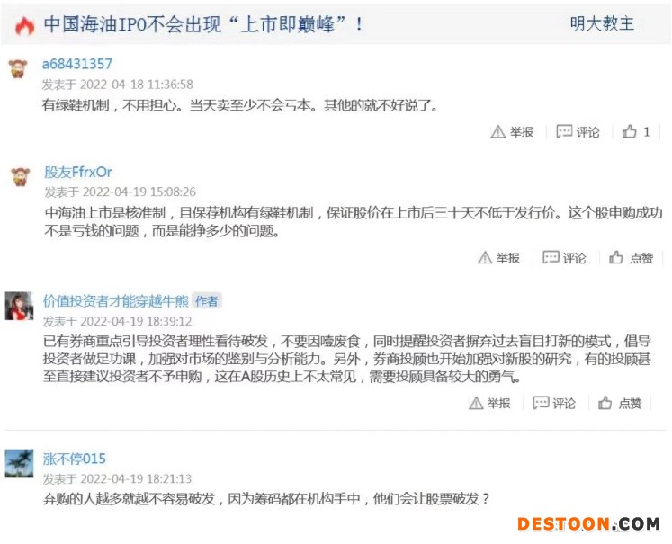 有投资者对中国海油上市首日的表现表示看好,“中国海油不会出现‘上市即巅峰’”“有绿鞋机制,不用担心,当天卖至少不会亏本”“中海油上市是核准制,且保荐机构有绿鞋机制,保证股价在上市后三十天不低于发行价,这个股申购成功不是亏钱的问题,而是能挣多少的问题”;还有投资者呼吁“理性看待破发”。