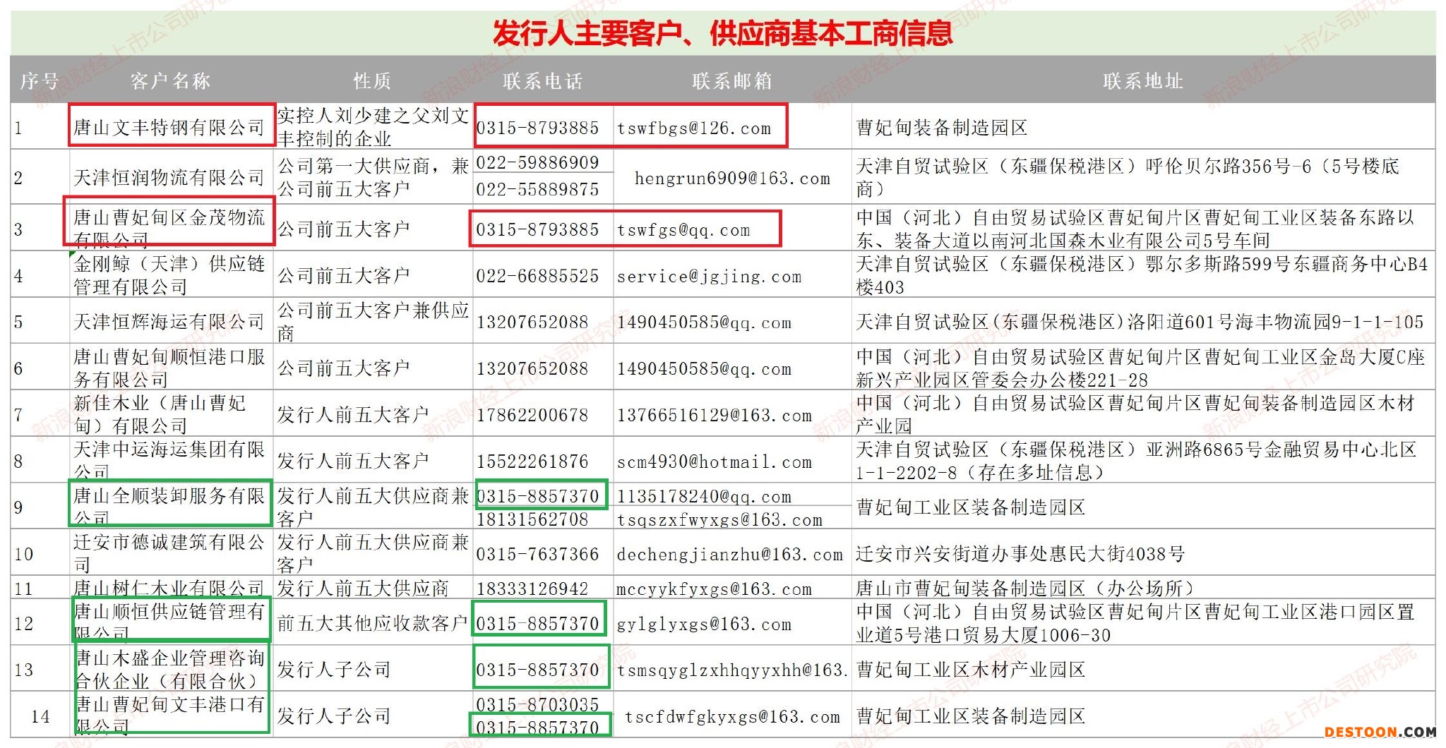 再如,木业股份前五大供应商之一的唐山全顺装卸服务有限公司(全顺装卸)竟然与公司子公司唐山木盛企业管理咨询合伙企业(有限合伙)、唐山曹妃甸文丰港口有限公司等公司的电话信息一致。难道全顺装卸与木业股份存在应披露但未披露的关联关系?