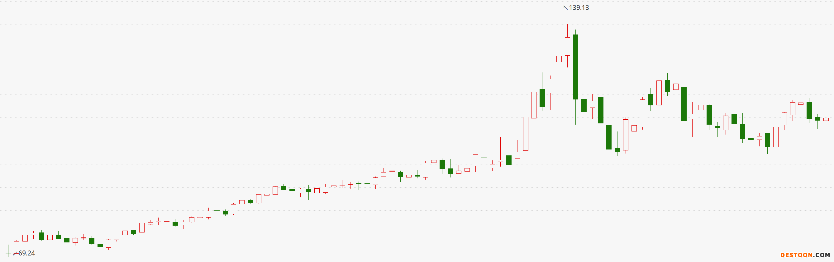 自今年以来,布伦特原油上涨35.94%,报107.26美元/每桶,期间最低点为78.62美元,最高点为139.13美元。