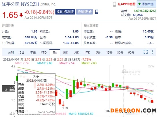 中国经济网北京4月21日讯 知乎昨日股价大跌。截至4月20日美股收盘,知乎收报1.65美元,跌幅9.84%。