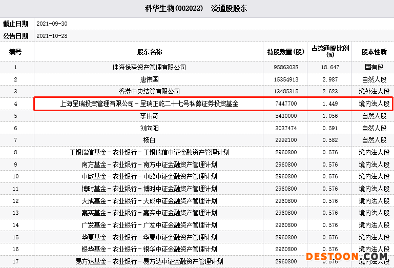 从该公司最新披露的2021年三季报看,上海呈瑞投资管理有限公司-呈瑞正乾二十七号私募证券投资基金持有744.77万股,位居第四大流通股东。