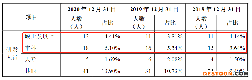 在科创板IPO阶段,国泰环保研发团队中有超半数人员是大专及以下学历。科创板首轮问询回复显示,2018—2020年,国泰环保的研发人员分别为55人、64人、77人。其中,本科及以上学历的研发人员总数分别为26人、27人、31人,占同期研发人员的比例分别为47,27%、42.19%、40.26%。