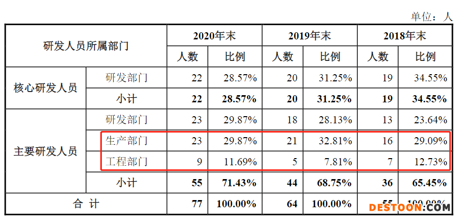 科创板二轮问询回复显示,国泰环保核心研发人员属于研发部门,主要研发人员所属部门则包括研发部门、生产部门、工程部门。2018—2020年,公司来自生产部门和工程部门的员工总数分别为23人、26人、32人,占同期研发人员的比例分别为41.82%、40.62%、41.56%。