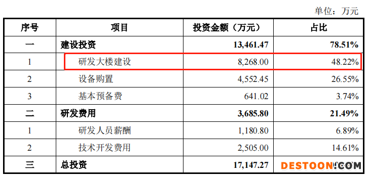 可以看到,研发中心项目募集资金投资额占募资总额51.98%,募集资金投资金额主要用于建设投资、研发费用两方面,其中8268万元将用于研发大楼的建设,占该项目投资总额的比例近五成。