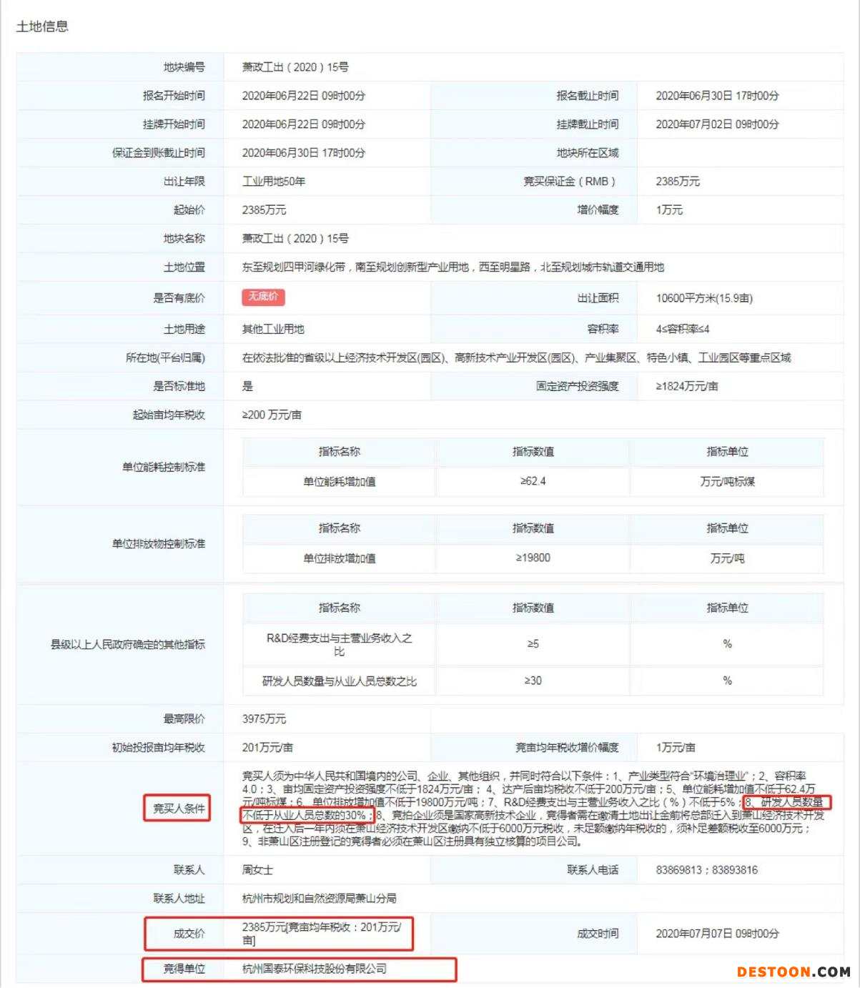 然而,浙江省土地使用权网上交易系统显示,萧政工出[2020]15号地块于2020年6月22日挂牌交易,并于2022年7月7日以2385万元被国泰环保竞得。值得注意的是,竞买人条件中明确要求“研发人员数量不低于从业人员总数的30%”。