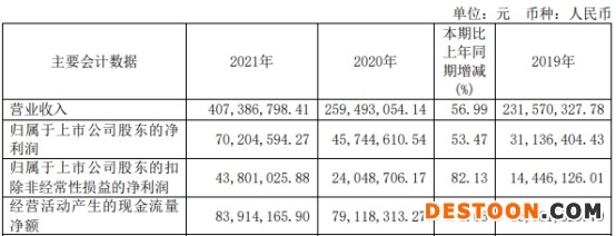 2021年,国芯科技实现营业收入4.07亿元,同比增长56.99%;实现归属于上市公司股东的净利润7020.46万元,同比增长53.47%;实现归属于上市公司股东的扣除非经常性损益的净利润4380.10万元,同比增长82.13%;经营活动产生的现金流量净额为8391.42万元,同比增长6.06%。