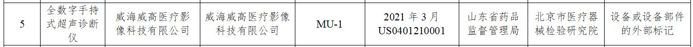 标示注册人、代理人为威海威高医疗影像科技有限公司的全数字手持式超声诊断仪,抽检发现不符合标准规定项目为设备或设备部件的外部标记,规格型号为MU-1,生产日期/批号/出厂编号为2021年3月/US0401210001。抽样单位为山东省药品监督管理局,检验单位为北京市医疗器械检验研究院。