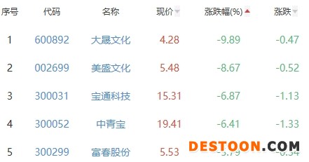大晟文化、美盛文化、宝通科技、中青宝、富春股份位列涨幅榜后五位,涨幅分别为-9.89%、-8.67%、-6.87%、-6.41%、-5.79%。