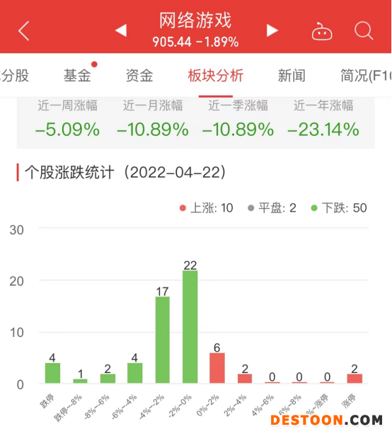 中国经济网北京4月22日讯 今日,网络游戏板块整体跌幅1.89%,其中10只股票上涨,2只股票平盘,50只股票下跌。