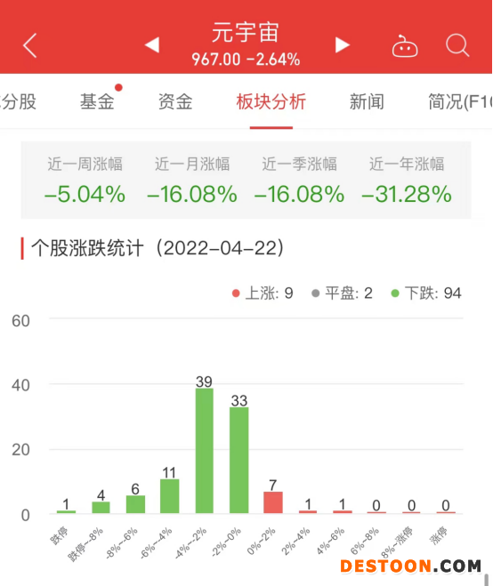 中国经济网北京4月22日讯 今日,元宇宙板块整体跌幅2.64%,其中9只股票上涨,2只股票平盘,94只股票下跌。