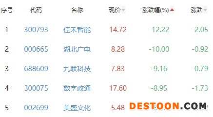 佳禾智能、湖北广电、九联科技、数字政通、美盛文化位列涨幅榜后五位,涨幅分别为-12.22%、-10.00%、-9.16%、-8.95%、-8.67%。