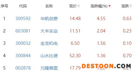其中,华凯创意、大丰实业、金龙机电、山水比德、元隆雅图位列板块涨幅前五位,涨幅分别为4.55%、2.04%、1.56%、1.36%、1.20%。