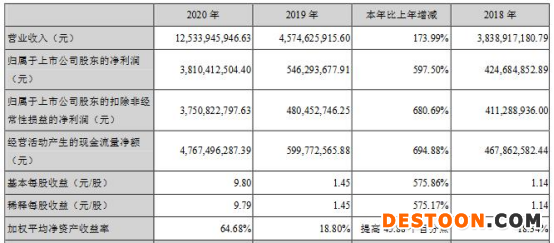 2020年,稳健医疗营业收入125.34亿元,同比增长173.99%;归属于上市公司股东的净利润38.10亿元,同比增长597.50%;归属于上市公司股东的扣除非经常性损益的净利润37.51亿元,同比增长680.69%;经营活动产生的现金流量净额47.67亿元,同比增长694.88%。