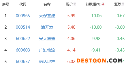 天保基建、渝开发、光大嘉宝、广汇物流、信达地产位列板块涨幅榜后五位,涨幅分别为-10.06%、-10.00%、-9.98%、-9.41%、-8.23%。
