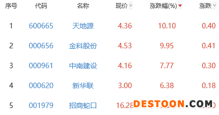 其中,天地源、金科股份、中南建设、新华联、招商蛇口位列板块涨幅榜前五位,涨幅分别为10.10%、9.95%、7.77%、6.38%、5.85%。