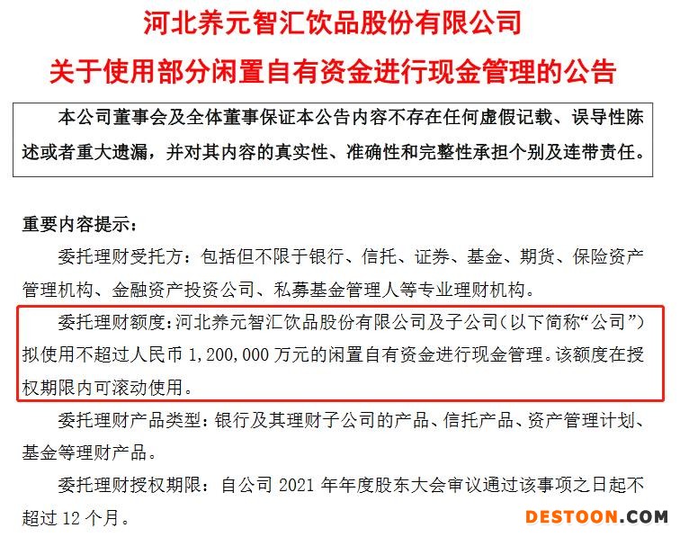 另外,养元饮品披露,拟使用不超过人民币120亿元闲置自有资金进行现金管理,产品类型包括行及其理财子公司的产品、信托产品、资产管理计划、基金等。