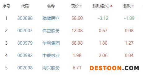 稳健医疗、伟星股份、华利集团、中银绒业和浔兴股份位列涨幅榜后五位,涨幅分别为-3.12%、0.67%、1.88%、2.06%和2.44%。