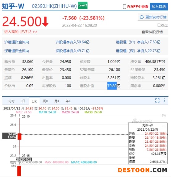 中国经济网北京4月22日讯 今日,知乎(02390.HK)正式登陆港交所,发行价每股32.06港元。该股今日低开低走,开盘破发,开盘价24.95港元,跌幅22.18%。截至今日收盘,该股报24.50港元,跌幅23.58%,港股总市值79.89亿港元。