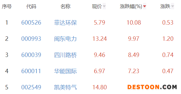 其中,菲达环保、闽东电力、四川路桥、华能国际、凯美特气位列板块涨幅前五位,涨幅分别为10.08%、9.97%、8.49%、7.23%、6.02%。