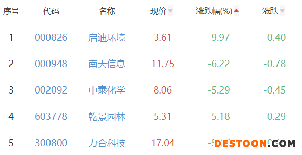 启迪环境、南天信息、中泰化学、乾景园林、力合科技位列涨幅榜后五位,涨幅分别为-9.97%、-6.22%、-5.29%、-5.18%、-5.17%。
