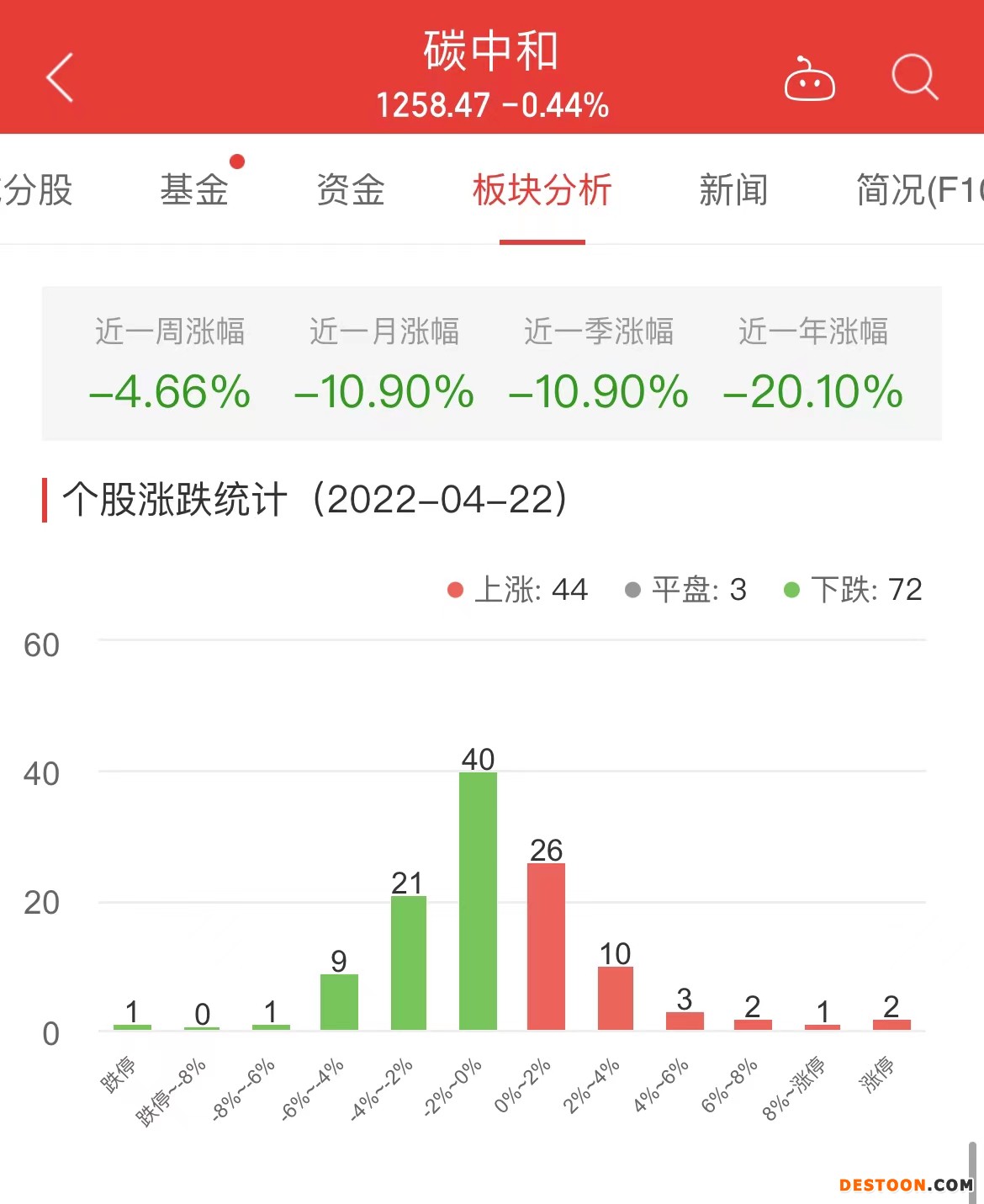 中国经济网北京4月22日讯 今日,碳中和板块整体跌幅0.44%,其中44只股票上涨,3只股票平盘,72只股票下跌。