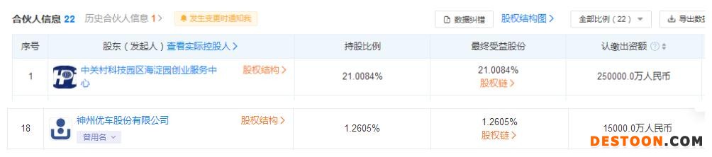 据合伙人信息显示,北京中关村并购母基金投资中心(有限合伙)由中关村科技园区海淀园创业服务中心持股21%,认缴出资额为250亿元,由神州优车持股1.26%,认缴出资额为15000万元。