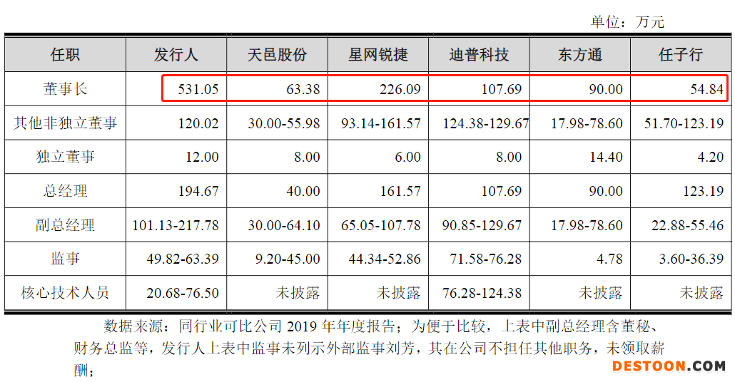 2019年,浩瀚深度董事长、总经理、副总经理的薪酬水平高于同行业可比公司,其中公司董事长张跃薪酬高达531.05万元。除此之外,公司其他非独立董事、独立董事及监事的薪酬也处于较高水平。