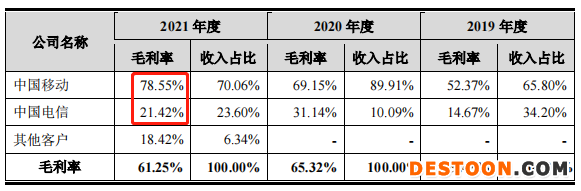 值得注意的是,浩瀚深度的互联网信息安全管理系统的毛利率按客服结构分类存在较大差异。招股书显示,2021年浩瀚深度向中国移动销售互联网信息安全管理系统的毛利率高达78.55%,远超中国电信的21.42%。