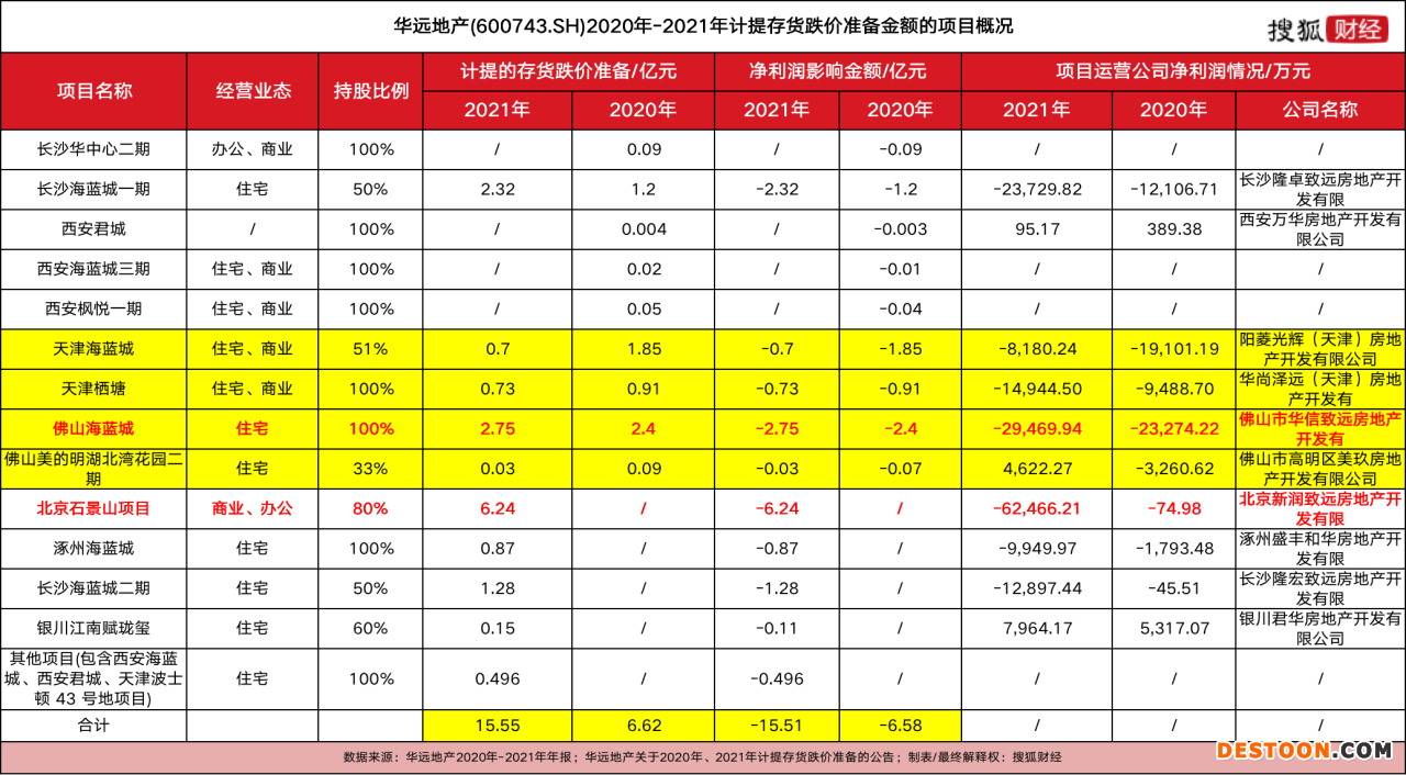再对照华远地产发布的具体项目计提情况梳理可发现,华远地产天津海蓝城、天津栖塘、佛山海蓝城、佛山美的明湖北湾花园二期这四个项目连续两年计提,累计计提9.46亿元;2021年仅北京石景山单个项目,便计提6.24亿元,占当期计提总额的40%。