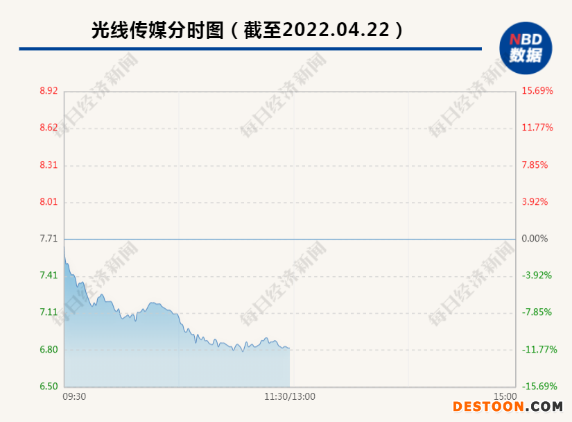 4月22日,光线传媒(300251)股价低开低走,截至午间收盘,光线传媒报6.82元/股,跌幅11.54%,成交金额3.63亿元,最新市值200.1亿元。值得注意的是,半个交易日,26亿市值蒸发。