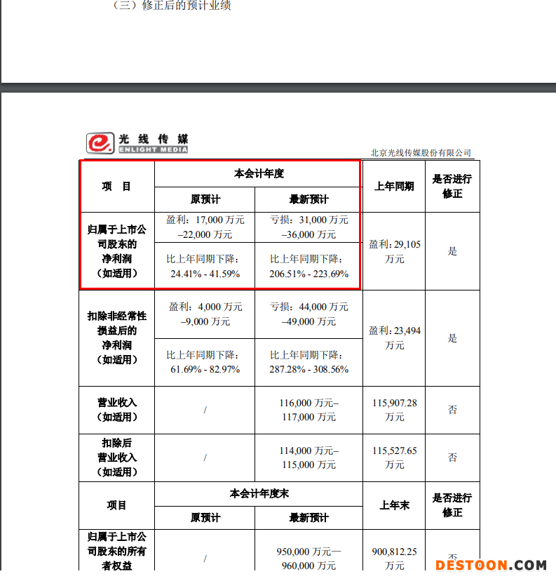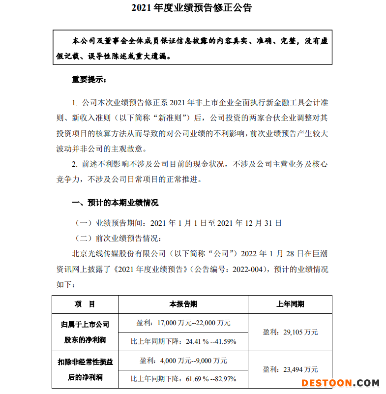 光线传媒表示,本次业绩预告修正系2021年非上市企业全面执行新准则后,公司投资的两家合伙企业调整对其投资项目的核算方法从而导致的对公司业绩的不利影响,前次业绩预告产生较大波动并非公司的主观故意。