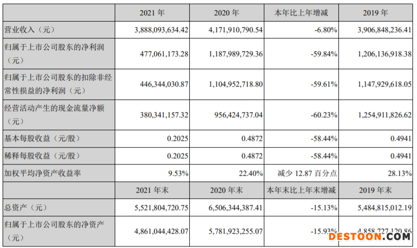 2021年,南极电商经营活动产生的现金流量净额为3.80亿元,同比下降60.23%;基本每股收益0.2025元,同比下降58.44%;加权平均净资产收益率为9.53%,比上年同期减少12.87个百分点。