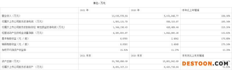 4月21日晚间,宁德时代发布2021年年度报告。宁德时代2021年实现营业收入1303.56亿元,同比增长159.06%;实现归母净利润159.31亿元,同比增长185.34%。
