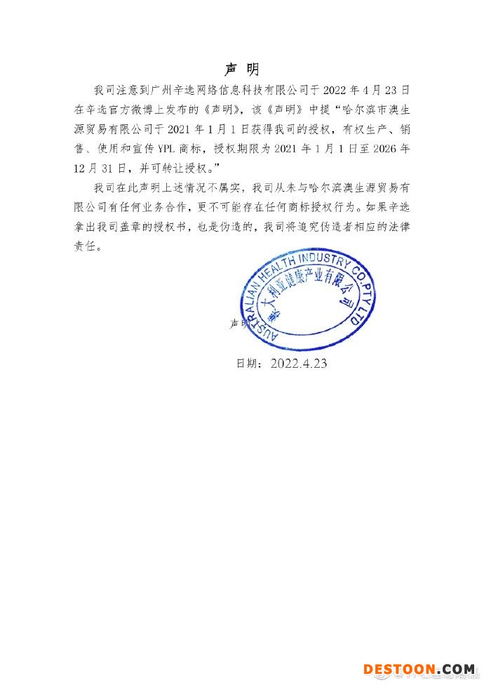 辛选方面指出,YPL商标的原持有人为澳大利亚健康产业有限公司(健康产业公司),哈尔滨市澳生源贸易有限公司(下称“澳生源”)于2021年1月1日获得健康产业公司的授权,有权生产、销售、使用和宣传YPL商标,授权期限为2021年1月1日至2026年12月31日,并可转让授权。